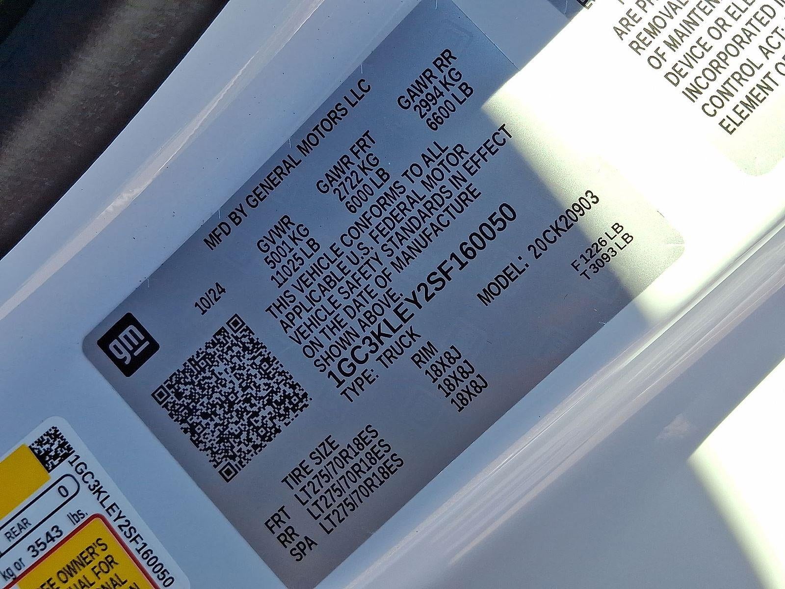 DURABED, PICKUP BED, EMISSIONS, COLORADO, CONNECTICUT, DELAWARE, MAINE, MARYLAND, MASSACHUSETTS, MINNESOTA, NEVADA, NEW JERSEY, NEW YORK, OREGON, PENNSYLVANIA, RHODE ISLAND, VERMONT, VIRGINIA AND WASHINGTON STATE REQUIREMENTS, EMISSIONS OVERRIDE, FEDERAL, ENGINE, DURAMAX 6.6L TURBO-DIESEL V8, TRANSMISSION, ALLISON 10-SPEED AUTOMATIC, GVWR, 11,025 LBS. (5001 KG), REAR AXLE, 3.42 RATIO, WHEELS, 18"" (45.7 CM) HIGH GLOSS BLACK ALUMINUM, TIRES, LT275/70R18E ALL-TERRAIN, BLACKWALL, TIRE, SPARE LT275/70R18 ALL-TERRAIN, BLACKWALL, SUMMIT WHITE, SEATS, FRONT 40/20/40 SPLIT-BENCH, JET BLACK, CLOTH SEAT TRIM, AUDIO SYSTEM, CHEVROLET INFOTAINMENT 3 SYSTEM, ALASKAN SNOW PLOW SPECIAL EDITION, WT CONVENIENCE PACKAGE, SNOW PLOW PREP/CAMPER PACKAGE, ENGINE BLOCK HEATER, ALTERNATOR, 220 AMPS, SKID PLATES, EXHAUST BRAKE, LPO, BLACK TUBULAR ASSIST STEPS, 6"" RECTANGULAR, WINTER GRILLE COVER, LAMPS, SMOKED AMBER ROOF MARKER, (LED), MIRRORS, OUTSIDE POWER-ADJUSTABLE VERTICAL TRAILERING WITH HEATED AND AUTO-DIMMING UPPER GLASS, GLASS, DEEP-TINTED, DECAL, ALASKAN SNOW PLOW SPECIAL EDITION, CHEVYTEC SPRAY-ON BEDLINER, TAILGATE, GATE FUNCTION MANUAL WITH EZ LIFT, DEFOGGER, REAR-WINDOW ELECTRIC, MIRROR, INSIDE REARVIEW AUTO-DIMMING